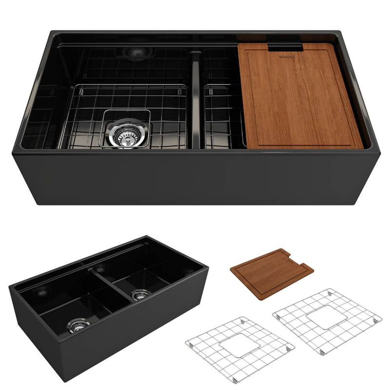 BOCCHI Contempo Step-Rim Apron Front Fireclay 36 in. Double Bowl Kitchen Sink with Integrated Work Station & Accessories